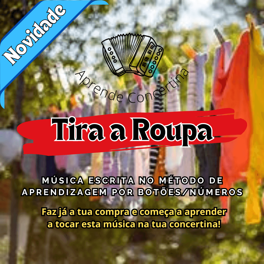 Já podes aprender a música Tira a Roupa (Música do Quim Barreiros) na tua concertina, experimenta o método de aprendizagem por botões e começa a tocar as tuas músicas na concertina. Método para concertinas com vários esquemas e tonalidades.